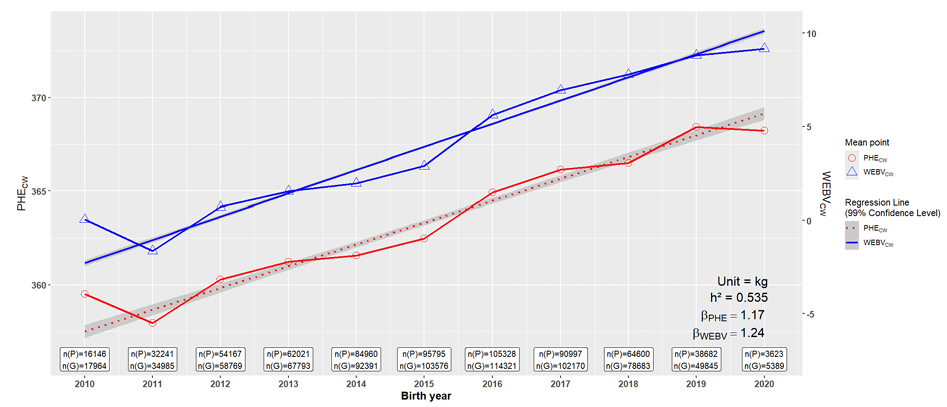 Figure 1. Adjusted phenotypic and genetic trends for carcass weight by birth year in Hanwoo cows. WEBV: Breeding values estimated using the whole dataset; PHE: Adjusted phenotype; CW: Carcass weight; n(P): Number of records for adjusted phenotypic carcass weight by birth year; n(G): Number of records for estimated breeding values of carcass weight by birth year