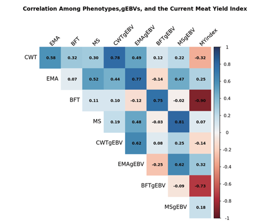 Figure 1. Correlation among carcass phenotypes, genomic EBVs, and the current meat yield index. CWT: Carcass Weight; EMA: Eye Muscle Area; BFT: Back Fat Thickness; MS: Marbling Score; gEBV: Genomic Estimated Breeding Value; MY index: Meat Yield Index.