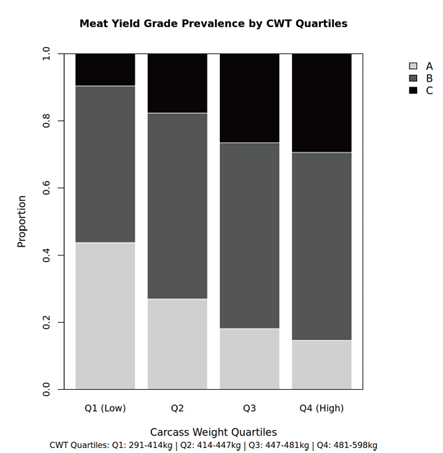 Figure 2. Distribution of meat yield grades by carcass weight groups. CWT Quantile 1: 291 ~ 414(kg); CWT Quantile 2: 414 ~ 447(kg); CWT Quantile 3: 447 ~ 481(kg); CWT Quantile 4: 481 ~ 598(kg).