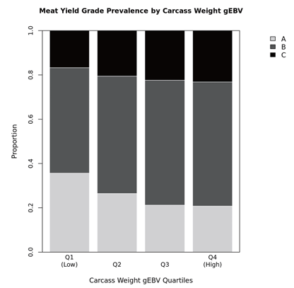 Table 4. Proportions of meat yield grades (A, B, C) across quartiles of carcass weight gEBV