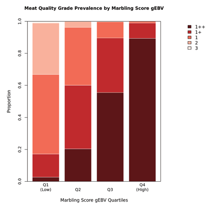 Table 5. Proportions of meat quality grades (1++, 1+, 1, 2, 3) across quartiles of marbling score gEBV.