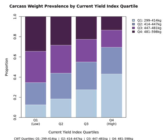 Figure 5. Distribution of carcass weight groups by current meat yield index quartiles. CWT Quantile 1: 291 ~ 414(kg); CWT Quantile 2: 414 ~ 447(kg); CWT Quantile 3: 447 ~ 481(kg); CWT Quantile 4: 481 ~ 598(kg); Current MY index Quantile 1: 55.90 ~ 60.629; Current MY index Quantile 2: 60.629 ~ 61.632; Current MY index Quantile 3: 61.632 ~ 62.563; Current MY index Quantile 4: 62.563 ~ 67.92