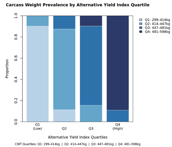 Figure 6. Distribution of carcass weight groups by alternative meat yield index quartiles. CWT Quantile 1: 291 ~ 414(kg); CWT Quantile 2: 414 ~ 447(kg); CWT Quantile 3: 447 ~ 481(kg) CWT Quantile 4: 481 ~ 607(kg); Alternative MY index Quantile 1: 187.09 ~ 255.565; Alternative MY index Quantile 2: 255. 565 ~ 274.046; Alternative MY index Quantile 3: 274. 046 ~ 294.655; Alternative MY index Quantile 4: 294.655 ~ 376.3655.
