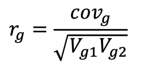 , where rg represents the genetic correlation, covg is the genetic covariance between two traits, and Vg1 and Vg2 denote the genetic variances of traits 1 and 2, respectively.