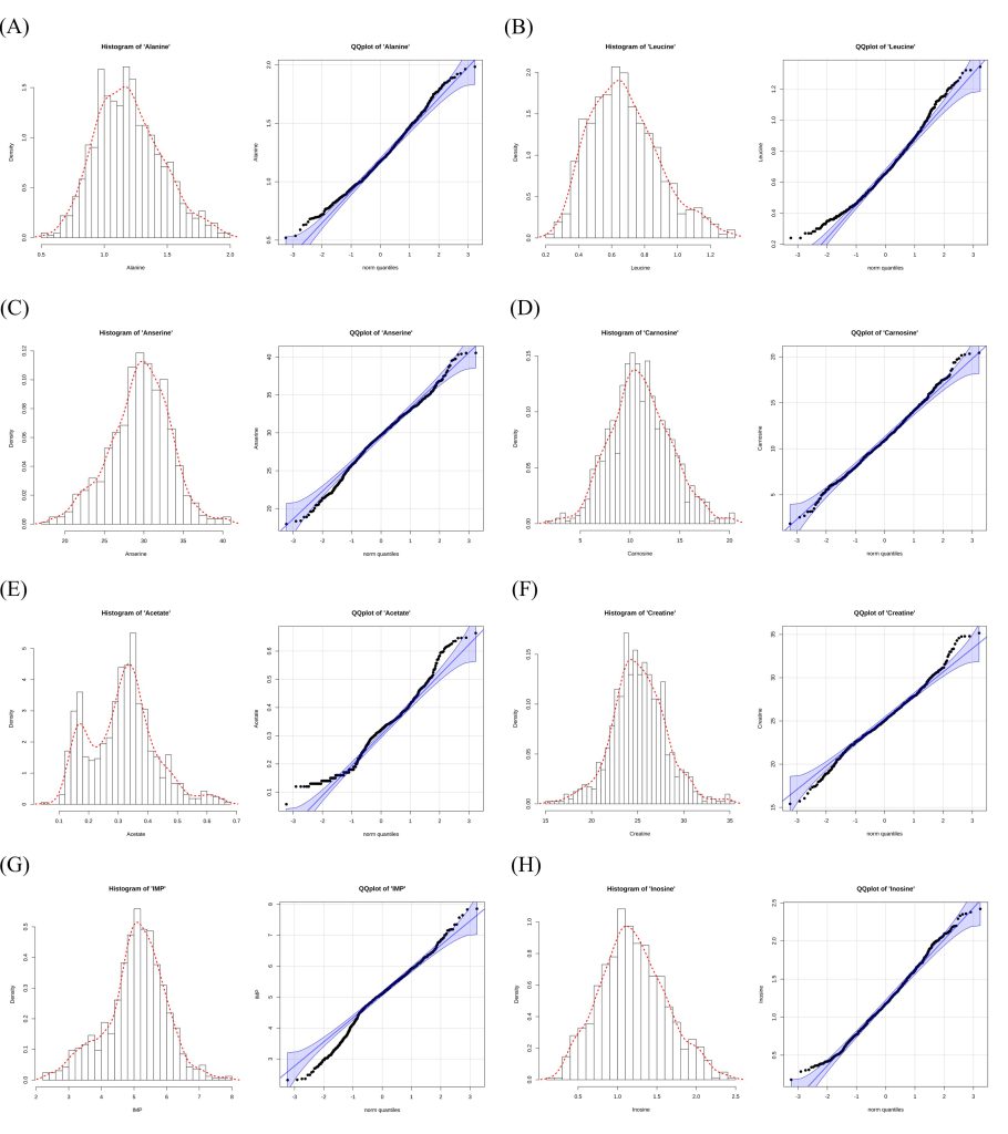 Figure 1. Histogram and quantile-quantile plot of taste-active compound data. (A) Alanine, (B) Leucine, (C) Anserine, (D) Carnosine, (E) Acetate, (F) Creatine, (G) Inosine 5*-monophosphate (IMP) (H) Inosine.