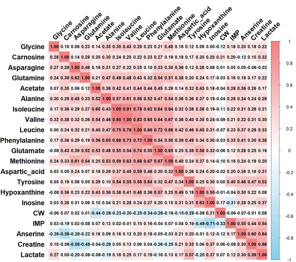 Figure 2. Genetic and phenotypic correlation of taste-active compound and carcass weight (CW) traits. Genetic correlations are shown in the lower diagonal, while phenotypic correlations are shown in the upper diagonal.