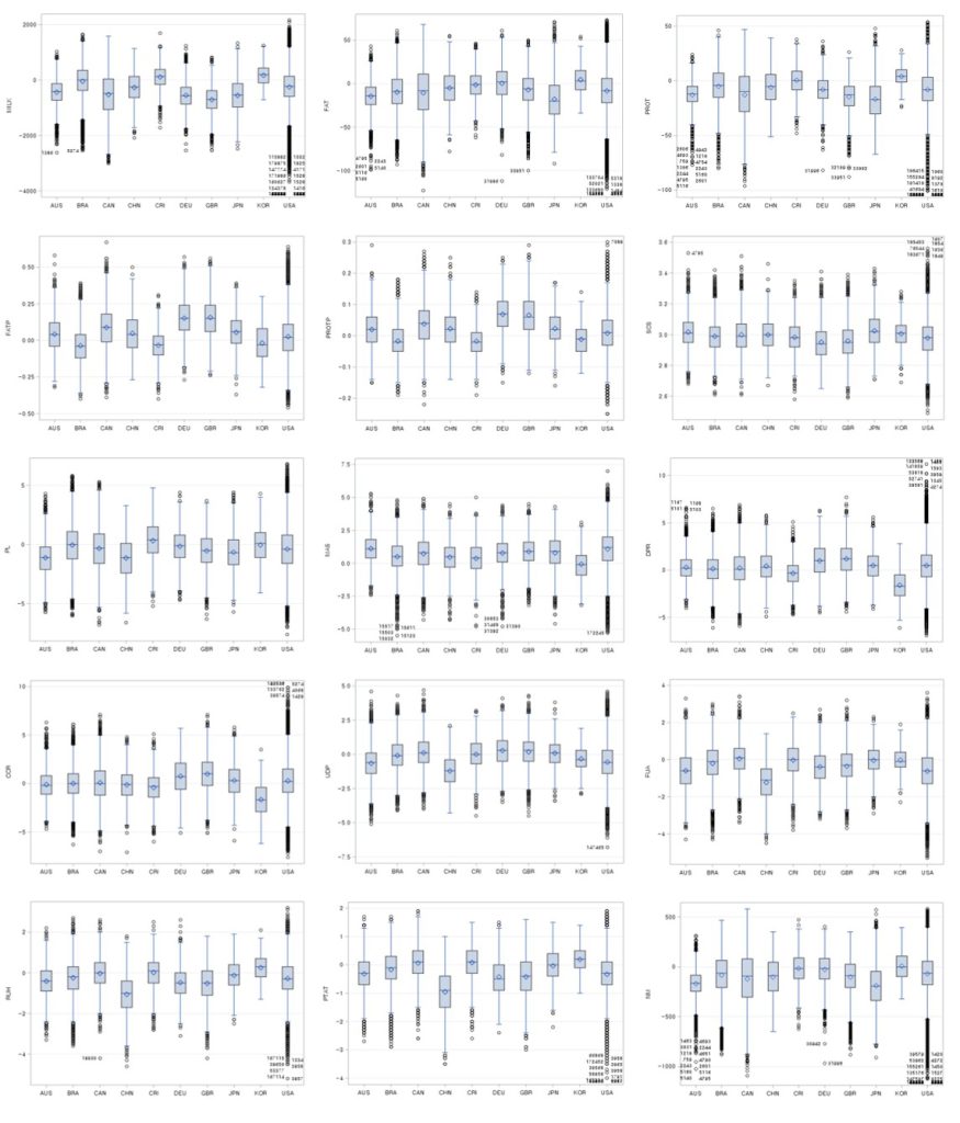 Figure 1. Distributions of MILK, FAT, PROT, FATP, PROTP, SCS, PL, MAS, DPR, CCR, UDP, FUA, RUH, PTAT and CM from top left to low right by nation