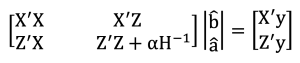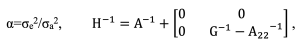 A-1 = 혈연계수행렬의 역행렬, G-1=유전체관계행렬의 역행렬, A22-1=유전체정보를 가지고 있는 개체들의 혈연계수행렬의 역행렬이며, α=오차분산/유전분산이다.